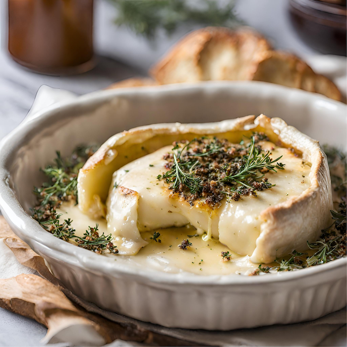 This will have your guests drooling...make a slice in a wheel of Brie, sprinkle Truffle Seasoning, close the slice, drizzle honey, add a few sprigs of thyme, and bake for 5-10mins. Enjoy!