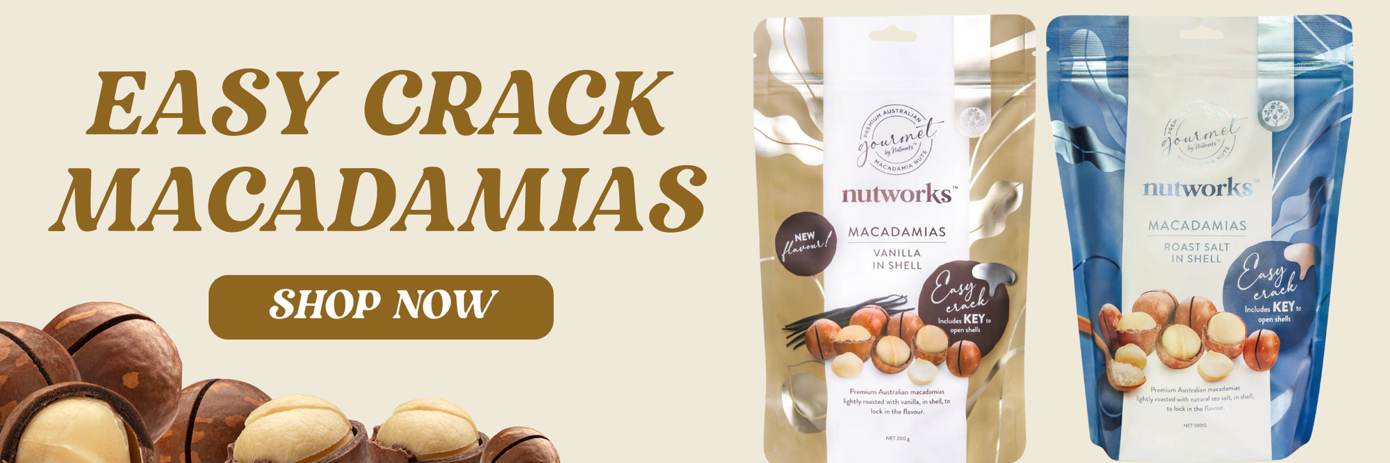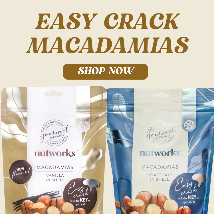 These premium macadamia kernels are bathed in vanilla and carefully dry-roasted in the shell to create that perfect crunch. You crack these yourselves with a special key contained in each pack.