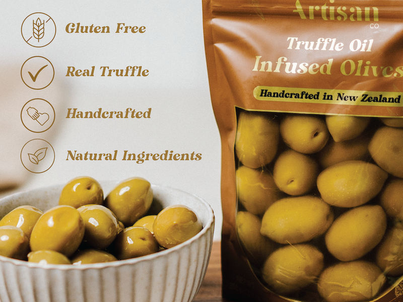 Delicious green olives, infused with premium New Zealand truffle oil. Handcrafted in small batches to create a smooth flavour sensation. Store in a cool dark place for up to 12 months and enjoy when those olive cravings hit.