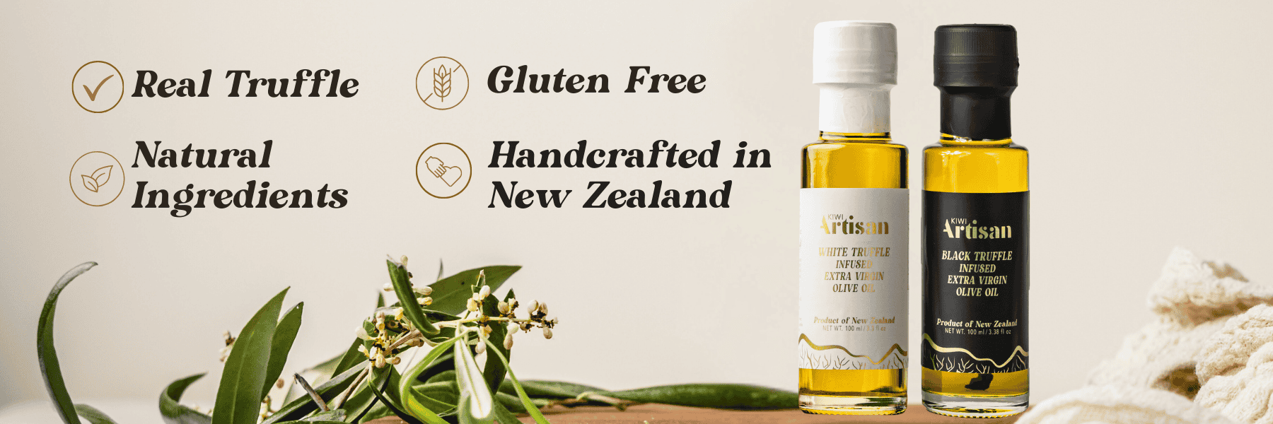 First press oil from olives grown south of Auckland, which infuses with the truffle extract and shavings, to create our New Zealand Black Truffle Olive Oil.